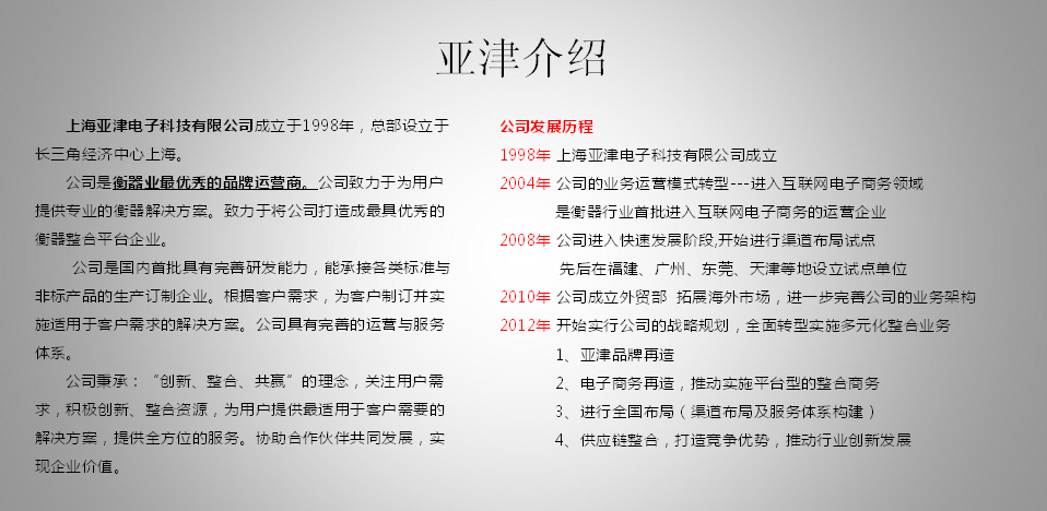 上海亞津電子科技有限公司主要生產(chǎn)和銷售各種電子秤,電子臺秤,電子地磅,高精度電子秤、汽車衡、電子吊秤、電子鋼瓶 秤、叉車秤、防爆秤、衡器配件等衡器稱重產(chǎn)品,同時誠招全國代理商,歡迎廣大客戶來電咨詢!我們將為您提供優(yōu)質(zhì) 的服務(wù)!