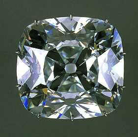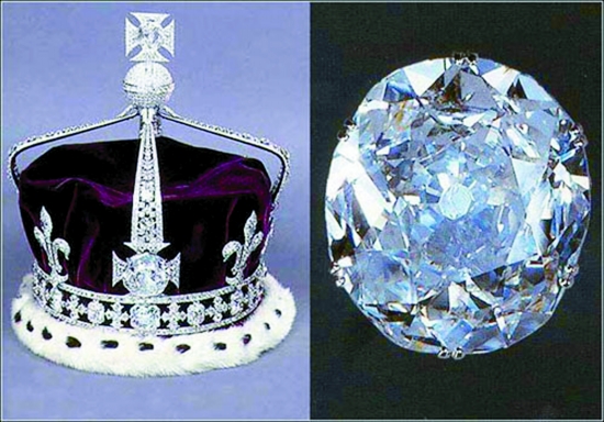 同樣源產(chǎn)于印度,原石的重量據(jù)說有800克拉之多。后幾經(jīng)切磨,由玫瑰型至現(xiàn)在的圓形,由專業(yè)電子天平稱得重量為108.93克拉,與切下的碎鉆一起鑲在維多利亞女王王冠上。這顆鉆石的輾轉(zhuǎn)同樣伴隨著謀殺與叛變,最后在一場(chǎng)戰(zhàn)爭(zhēng)中被掠奪至英國。直到最近還曾引起印度政府與英國王室的紛爭(zhēng)。