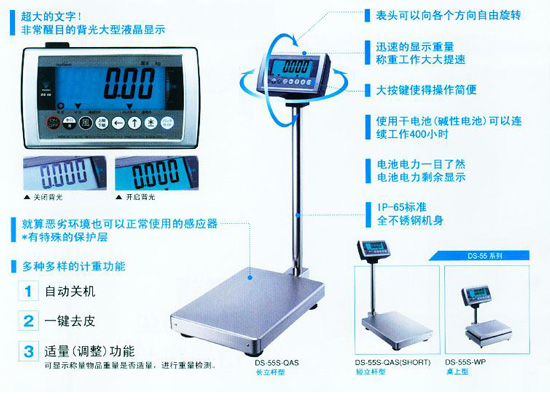 DS-55不銹鋼數(shù)字臺(tái)秤、 防水型設(shè)計(jì)、IP-65標(biāo)準(zhǔn)全不銹鋼機(jī)身 高強(qiáng)度機(jī)身、堅(jiān)固耐用;特別針對(duì)有水作業(yè)區(qū):防水、防銹、耐腐蝕 灰塵封閉 快速且超大的數(shù)字顯示,非常醒目的背光大型液晶顯示 表頭可以向各個(gè)方向自由旋轉(zhuǎn) 大按鍵方便操作 電池電量顯示一目了然 自動(dòng)關(guān)機(jī)功能 一鍵去皮功能 適量調(diào)整功能